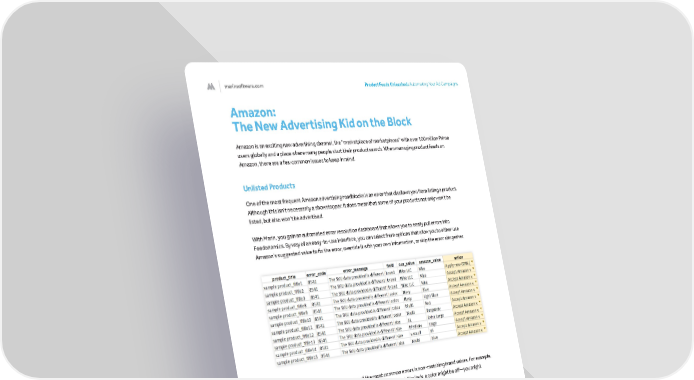 marinsoftware.com Product Feeds Unleashed: Automating Your Ad Campaigns 12 Amazon: The New Advertising Kid on the Block Amazon is an exciting new advertising channel, the “marketplace of marketplaces” with over 100 million Prime users globally and a place where many people start their product search. When managing product feeds on Amazon, there are a few common issues to keep in mind. Unlisted Products One of the most frequent Amazon advertising roadblocks is an error that disallows you from listing a product. Although this isn’t necessarily a showstopper, it does mean that some of your products not only won’t be listed, but also won’t be advertised. With Marin, you gain an automated error resolution dashboard that allows you to easily pull errors into Feedonomics. By way of an easy-to-use interface, you can select from options that allow you to either use Amazon’s suggested value to fix the error, override it with your own information, or skip the error altogether. As depicted in the example above, one of the most common errors is non-matching brand values. For example, Nike might list itself as ‘Nike, LLC’, but Amazon expects ‘Nike’. Similarly, a color might be off—you might specify ‘Navy’ while Amazon’s expected value is ‘blue’. You can set up overrides to immediately update, resolve errors, and get your products listed. This is something that most other feed platforms completely ignore. By building this directly into Marin, you can immediately resolve issues that often result in 10 to 30 percent of your products not being eligible for listing or advertising. The Amazon Parent-Child Hierarchy Another hurdle to overcome with Amazon advertising is parent-child relationships. If you’re already running a product feed on Amazon, you know that it’s a bit different than Google’s structure. While Google doesn’t require you to submit a parent-level row, Amazon does. This can get tricky, because most eCommerce platforms like Shopify or BigCommerce can’t natively pull parent-level rows out.