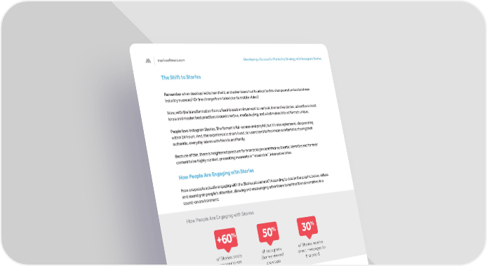 marinsoftware.com Developing a Successful Marketing Strategy with Instagram Stories 5 The Shift to Stories Remember when desktop led to handheld, and advertisers had to adapt to this change and understand new industry nuances? Or the change from television to mobile video? Now, with the transformation from a feed-based environment to vertical, immersive stories, advertisers must know and master best practices around creative, media buying, and what makes this ad format unique. People love Instagram Stories. The format is full-screen and playful, but it’s also ephemeral, disappearing within 24 hours. And, the experience is short-lived, so users tend to feel more comfortable sharing their authentic, everyday selves with friends and family. Because of this, there is heightened pressure for brands to present their authentic identities and for their content to be highly curated, presenting moments in “snackable”, interactive bites. How People Are Engaging with Stories How are people actually engaging with the Stories placement? According to data in the graphic below, videos and sound grab people’s attention, allowing and encouraging advertisers to tell traditional narratives in a sound-on environment: Significantly, one in three Stories receives a direct message from a user. So, if a brand posts an organic Story and people want to learn more, many of them contact the brand directly with questions such as, “How can I buy?” and “How can I learn more?” This is just one reason why Stories matter so much to businesses. And, as more people continue to move onto the platform, it becomes increasingly important for brands to go where consumers are, and understand and embrace best practices for maximizing engagement. of Stories posts are sound-on +60 % of Instagram Stories viewed are video 50 % of Stories receive direct messages to the brand 30 % How People Are Engaging with Stories Source: Instagram (https://business.instagram.com/a/stories)