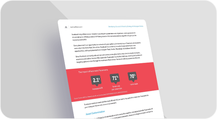 marinsoftware.com Developing a Successful Marketing Strategy with Instagram Stories 7 Facebook’s algorithm knows—based on your targeting parameters and objectives—which placements it should deliver to. It finds pockets of efficiency based on its back-end predictive algorithms to give you the highest possible ROI. Every placement is an opportunity to connect with your audience. In the early days of Facebook, ad placements were only in the News Feed. Since then, Facebook has constantly innovated to give advertisers more opportunities, adding ad placements to Instagram Feed, Stories, Messenger, and Audience Network. Since Facebook constantly rolls out new ad inventory in new placements, they strive to simplify the buying experience and deliver the best ROI. Automatic Placements rises to this challenge, providing ad objective and targeting options in Ads Manager for maximum effectiveness. Facebook’s delivery system does the rest. To ensure maximum reach and the most efficient ROI, be sure to stay opted in to Automatic Placements for your Instagram Stories ads, across all placements. Asset Customization As Facebook continues to roll out new placements across its properties, leveraging Automatic Placements will make it easier for advertisers to optimize to the best placements. However, it’s important to test and learn to identify the best placement strategy. In Ads Manager, placements are initially automatically selected. You can then go through these and customize creatives or specific placements depending on your goals. Why customize creative across placements? Since each placement has its own unique consumer behavior and interaction behavior, you may want custom creative for Instagram Stories, but also run Automatic Placements for the best ROI. To meet this need, Facebook introduced asset customization. Once you’ve selected all of Facebook’s placements in Ads Manager, you can also enter bespoke, unique creative for Stories that includes items like stickers, emojis, or overlays that are native to the platform. You can also add custom creative for Instagram, Facebook News Feed, Stories, etc., and compare performance. Asset customization is a powerful tool that allows you to easily select different placements, assign a unique creative for each one, and then test and learn. It drives better performance and delivery based on creative best practices for a given placement. increase in lift 2.1 x lower cost per conversion 71 % more reach 70 % The Impact of Automatic Placements Source: Facebook (https://www.facebook.com/business/help/196554084569964?id=369787570424415)
