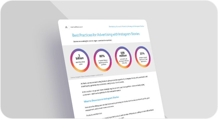 marinsoftware.com Developing a Successful Marketing Strategy with Instagram Stories 9 Best Practices for Advertising with Instagram Stories Stories are working for brands. Again, consider the numbers. At Marin, we recommend using Stories to give people the opportunity to engage directly with your brand, build brand loyalty, generate new customers, and give your brand a voice. In this section, we go over more strategic ways to convert users into loyal fans—and eventually paying customers—and how to optimize for the best performance. What to Showcase on Instagram Stories Here are a few things you can start showcasing on Instagram Stories now to raise your brand’s profile, grow engagement, and convert more customers. Products and Services First off, always show your most important products and services. What are you selling and what differentiates you in the marketplace? What is your brand’s value-add? Deals and Promotions Everyone loves a good deal. Once users start to notice that Stories are an outlet for you to market exclusive offers, they’ll continue to stay engaged and look to your Instagram Stories or your account for additional promotions. monthly active users of users follow a business on the platform accounts use Instagram Stories every day of most-viewed Stories are from businesses 500 million 80% 1 billion 33% Source: Instagram (https://business.instagram.com/a/stories)