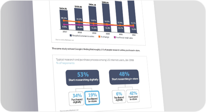 marinsoftware.com The Online-to-Offline Search Marketing Playbook US retail eCommerce sales, 2017-2022 billions % change and % of total retail sales $891.77 $787.15 $690.84 $604.18 $526.09 $454.91 16.3% 15.6% 14.8% 14.3% 13.9% 15.1% 9.0% 10.0% 11.1% 12.4% 13.7% 13.3% 2017 2018 2019 2020 2021 2022 Retail eCommerce sales % change % of total retail sales Source: www.eMarketer.com The same study echoed Google’s finding that roughly 1/3 of people research online, purchase in-store. Typical research and purchase process among US internet users, Jan 2018 % of responents 53% 48% Start researching digitally Start researching in-store 34% 19% 6% 42% Purchased Purchased Purchased Purchased digitally in-store digitally in-store Source: www.eMarketer.com