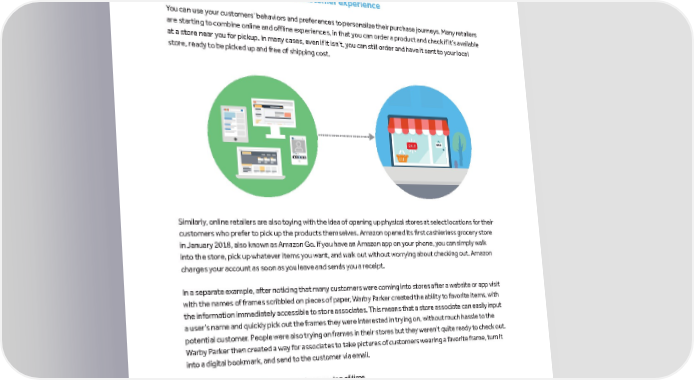 marinsoftware.com The Online-to-Offline Search Marketing Playbook Tactics for Growing Online-to-Offline Conversions Create an ideal online-to-offline customer experience You can use your customers’ behaviors and preferences to personalize their purchase journeys. Many retailers are starting to combine online and offline experiences, in that you can order a product and check if it’s available at a store near you for pickup. In many cases, even if it isn’t, you can still order and have it sent to your local store, ready to be picked up and free of shipping cost. username 6min SALE 14 Likes usernameComment Like Comment Similarly, online retailers are also toying with the idea of opening up physical stores at select locations for their customers who prefer to pick up the products themselves. Amazon opened its first cashierless grocery store in January 2018, also known as Amazon Go. If you have an Amazon app on your phone, you can simply walk into the store, pick up whatever items you want, and walk out without worrying about checking out. Amazon charges your account as soon as you leave and sends you a receipt. In a separate example, after noticing that many customers were coming into stores after a website or app visit with the names of frames scribbled on pieces of paper, Warby Parker created the ability to favorite items, with the information immediately accessible to store associates. This means that a store associate can easily input a user’s name and quickly pick out the frames they were interested in trying on, without much hassle to the potential customer. People were also trying on frames in their stores but they weren’t quite ready to check out. Warby Parker then created a way for associates to take pictures of customers wearing a favorite frame, turn it into a digital bookmark, and send to the customer via email. Both are creative ideas that save customers a ton of time.