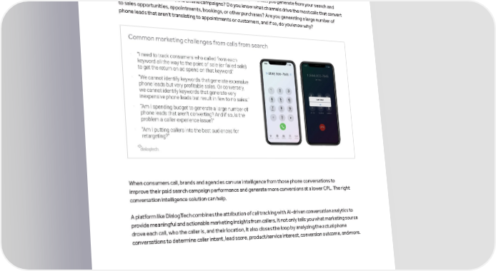 marinsoftware.com The Online-to-Offline Search Marketing Playbook Get Actionable Insights from Calls with Conversation Intelligence As a marketer, do you have visibility into the calls and caller experiences you generate from your search and digital ads, SEO, websites, and offline campaigns? Do you know what channels drive the most calls that convert to sales opportunities, appointments, bookings, or other purchases? Are you generating a large number of phone leads that aren’t translating to appointments or customers, and if so, do you know why? Common marketing challenges from calls from search When consumers call, brands and agencies can use intelligence from those phone conversations to improve their paid search campaign performance and generate more conversions at a lower CPL. The right conversation intelligence solution can help. A platform like DialogTech combines the attribution of call tracking with AI-driven conversation analytics to provide meaningful and actionable marketing insights from callers. It not only tells you what marketing source drove each call, who the caller is, and their location, it also closes the loop by analyzing the actual phone conversations to determine caller intent, lead score, product/service interest, conversion outcome, and more.