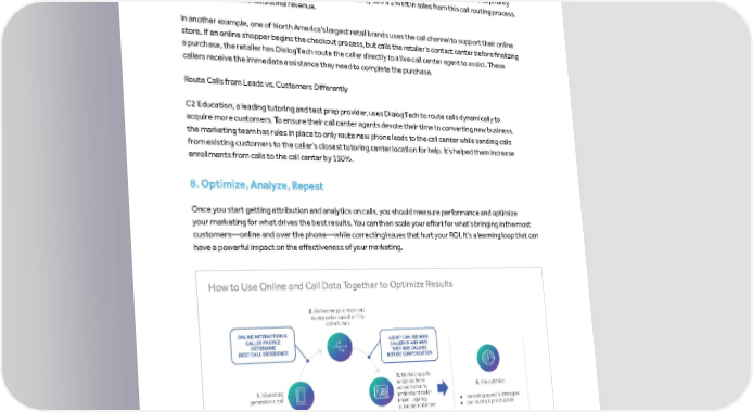marinsoftware.com The Online-to-Offline Search Marketing Playbook Prioritize Your Most Valuable Callers A larger insurance provider determined that consumers in certain ZIP Codes were responsible for more high- profile prospect calls, so the marketing team uses DialogTech to prioritize call routing based on the caller’s location. All calls go to their call center, but now they put callers from high-converting ZIP Codes into priority queues to get answered right away. After two months, they saw a 2% lift in sales from this call routing process, resulting in millions in additional revenue. In another example, one of North America’s largest retail brands uses the call channel to support their online store. If an online shopper begins the checkout process, but calls the retailer’s contact center before finalizing a purchase, the retailer has DialogTech route the caller directly to a live call center agent to assist. These callers receive the immediate assistance they need to complete the purchase. Route Calls from Leads vs. Customers Differently C2 Education, a leading tutoring and test prep provider, uses DialogTech to route calls dynamically to acquire more customers. To ensure their call center agents devote their time to converting new business, the marketing team has rules in place to only route new phone leads to the call center while sending calls from existing customers to the caller’s closest tutoring center location for help. It’s helped them increase enrollments from calls to the call center by 150%. 8.Optimize, Analyze, Repeat Once you start getting attribution and analytics on calls, you should measure performance and optimize your marketing for what drives the best results. You can then scale your effort for what’s bringing in the most customers—online and over the phone—while correcting issues that hurt your ROI. It’s a learning loop that can have a powerful impact on the effectiveness of your marketing. How to Use Online and Call Data Together to Optimize Results