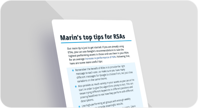 Marin’s top tips for RSAs Our main tip is just to get started. If you are already using ETAs, you can use Google’s recommendations to take the highest performing assets in those and use them in your RSAs for an average increase in performance of 10% . Following that, here are some more useful tips: • Remember the benefit of RSAs is to provide the right message to each user, so make sure you have many different messages for Google to choose from, not just close variations on the same theme. • Also provide as much variety in your assets as you can at the start in order to give the algorithms plenty to test. This can mean trying different keywords in different positions and pinning headlines to see how they perform with different descriptions. • Use high-performing ad groups with enough weekly impressions to provide meaningful results. • Be specific and respond to your audience’s needs. Use a clear call to action that tells them what their click will do for them. • Include audiences at different stages of your sales funnel, with different problems and solutions and a range of products, services, and calls to action. • Prioritize headlines at first. Use your target keyword(s) and remember that customers are less likely to read a description if it doesn’t have a powerful, eye-catching headline to reel them in. Spend some time crafting a broad selection of solid headlines that include your top- performing keywords. 9 Marin Software