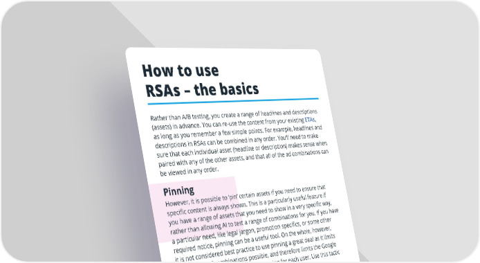 How to use RSAs – the basics Rather than A/B testing, you create a range of headlines and descriptions (assets) in advance. You can re-use the content from your existing ETAs , as long as you remember a few simple points. For example, headlines and descriptions in RSAs can be combined in any order. You’ll need to make sure that each individual asset (headline or description) makes sense when paired with any of the other assets, and that all of the ad combinations can be viewed in any order. Pinning However, it is possible to ‘pin’ certain assets if you need to ensure that specific content is always shown. This is a particularly useful feature if you have a range of assets that you need to show in a very specific way, rather than allowing AI to test a range of combinations for you. If you have a particular need, like legal jargon, promotion specifics, or some other required notice, pinning can be a useful tool. On the whole, however, it is not considered best practice to use pinning a great deal as it limits the number of combinations possible, and therefore limits the Google algorithm’s ability to customize messaging for each user. Use this tactic judiciously for out-of-the-ordinary messaging circumstances. For example, you can pin a description to ‘ position 1 ’ and it will be shown in every RSA, regardless of the headline used with it. However, unless you need to feature something specific, such as a disclaimer, it’s wise to retain the full ability of your ads to be adapted to match a range of search terms. 4 Marin Software